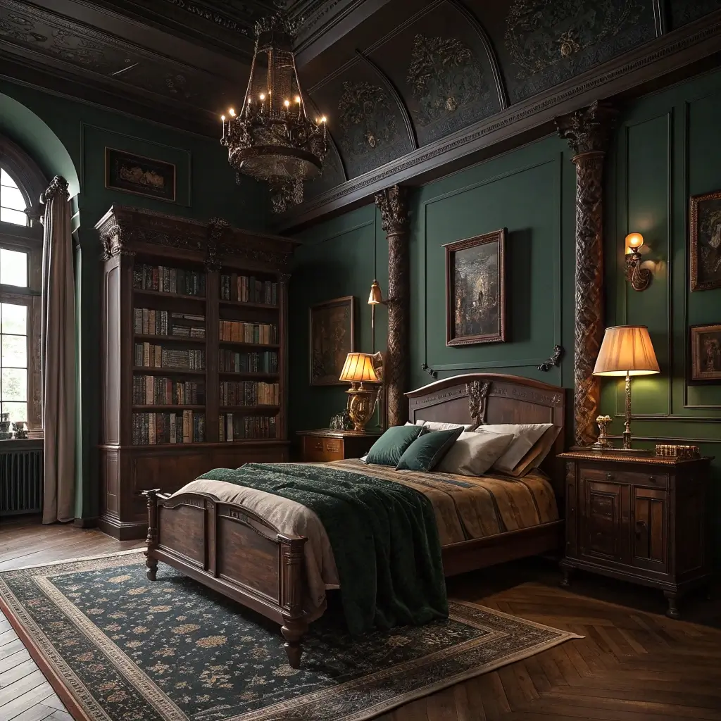 Dark academia bedrooms rely on rich, moody colors and classic elements that feel timeless and intellectual.