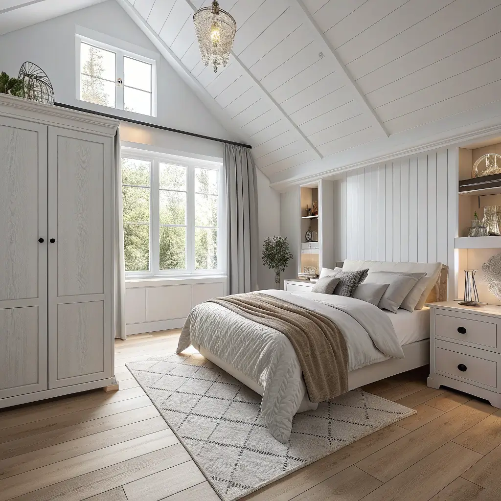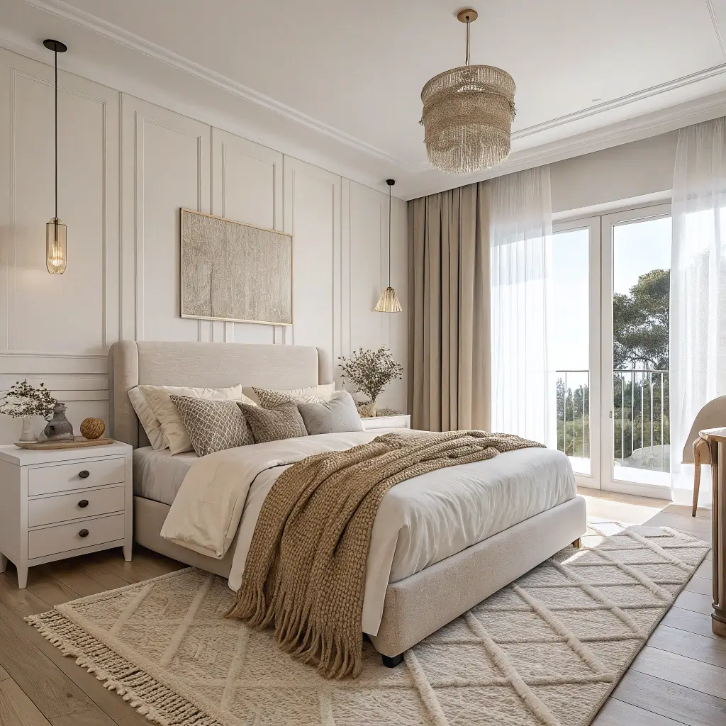 - Crisp, neutral bedding in whites, creams, or soft grays