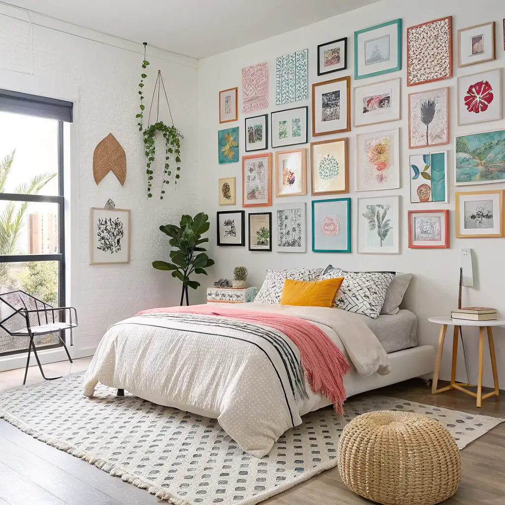 Finally, for creative souls who want their bedroom to reflect their personality, the artistic gallery wall bedroom puts self-expression front and center.
