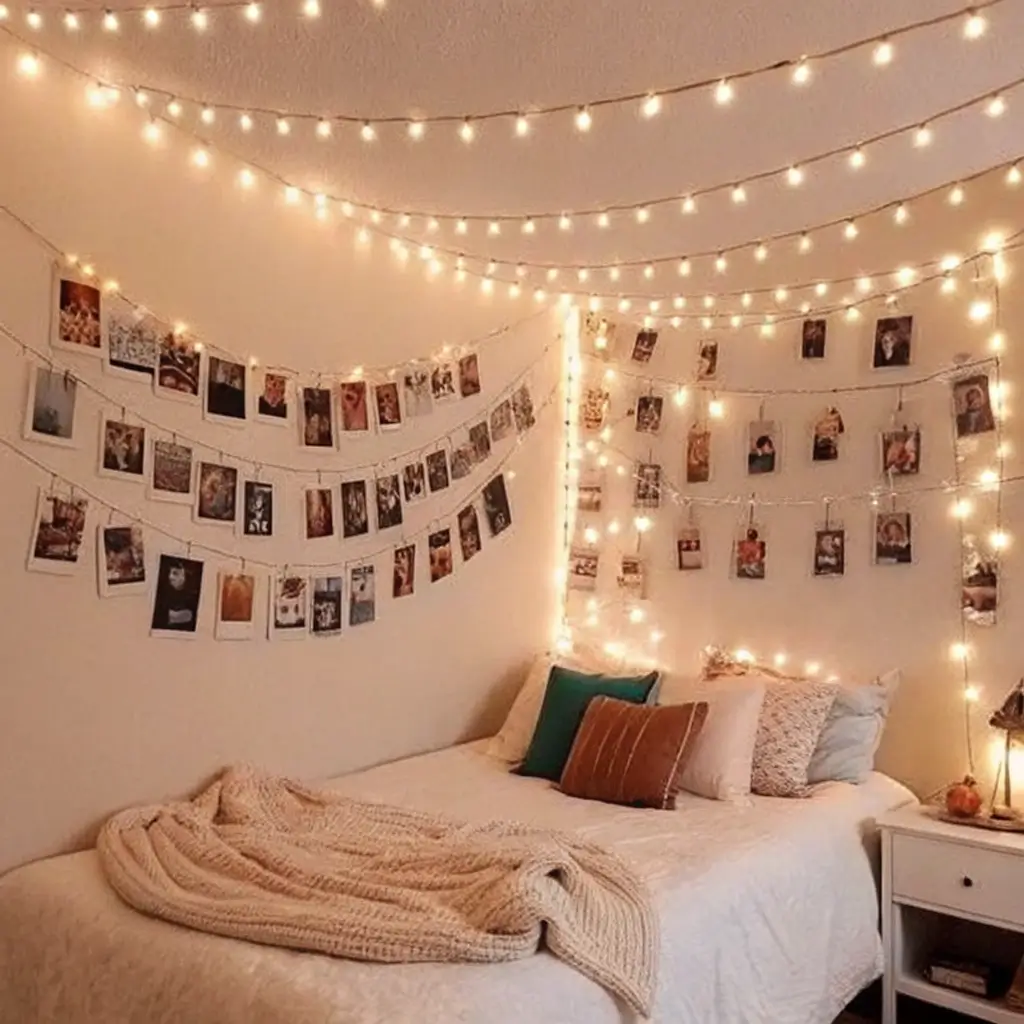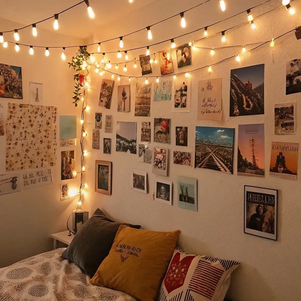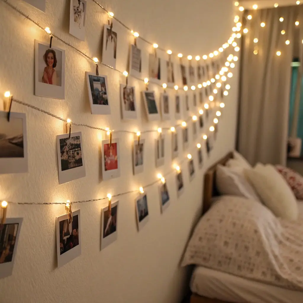 Fairy lights plus photos equals instant magic. This combination creates the coziest vibe possible, perfect for bedrooms that double as sanctuaries. I strung warm white LED lights in a zigzag pattern and clipped photos along the way.