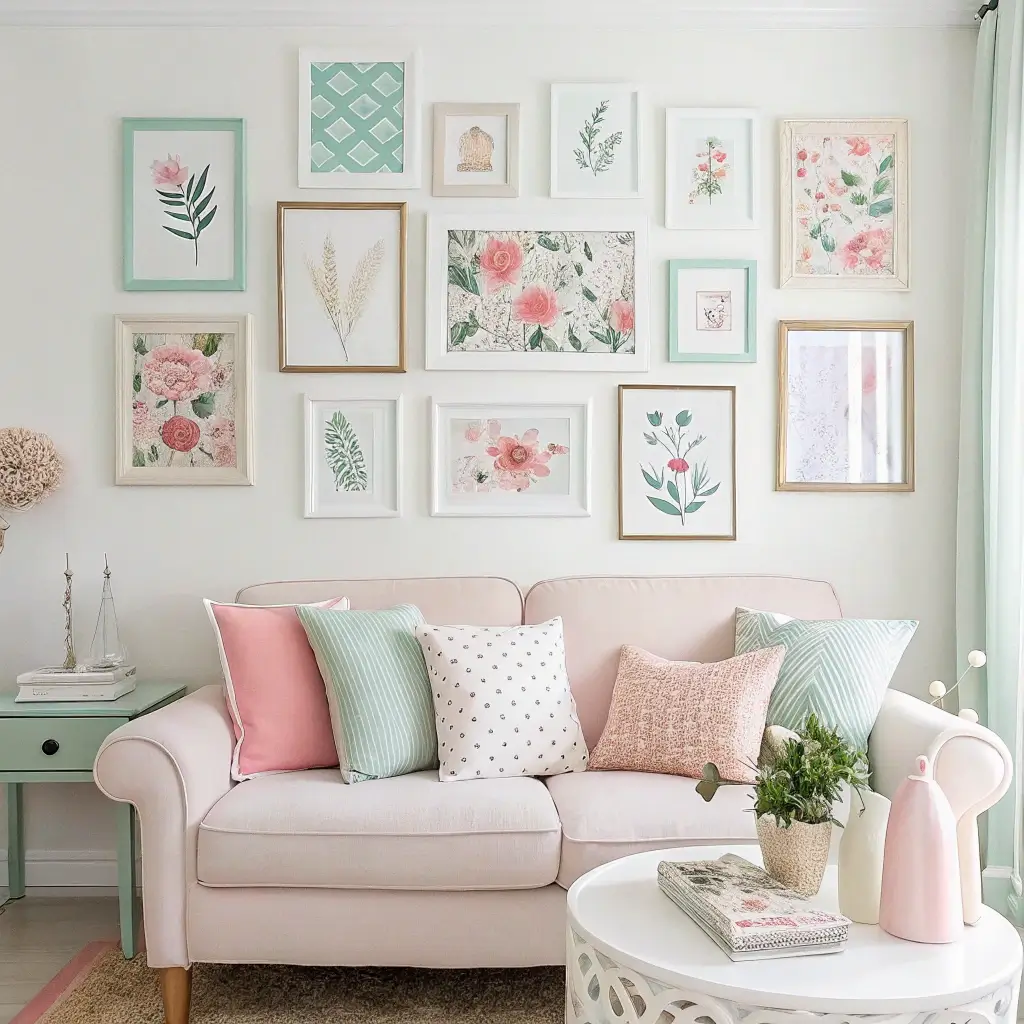 Who says gallery walls need to be serious? A pastel gallery wall brings that soft, dreamy aesthetic that makes your bedroom feel like a cloud. I went full millennial pink and mint green with mine, and honestly, it’s impossible to be in a bad mood when you’re surrounded by these colors.