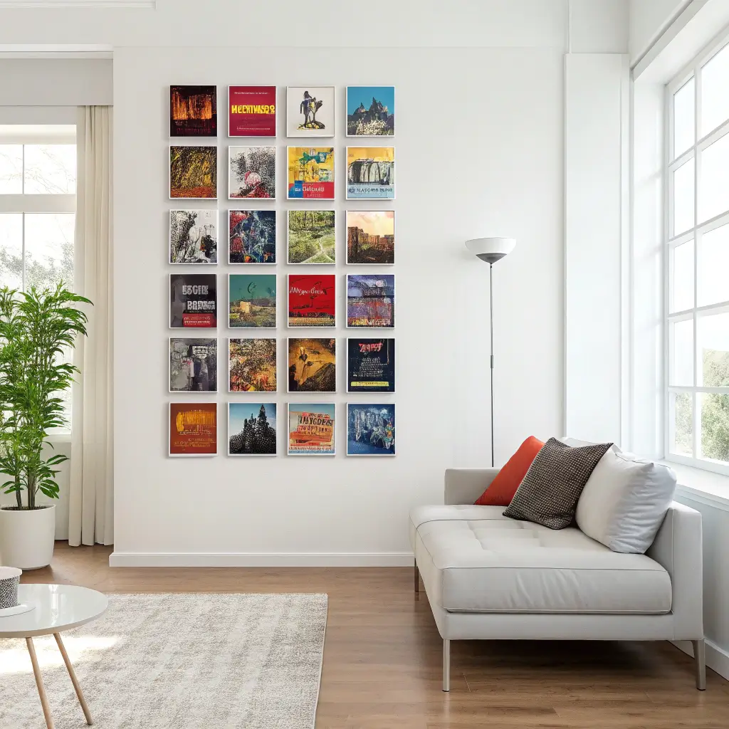 Consider mixing frame sizes too. 12×12 for standard albums, 7×7 for singles, and maybe throw in a 10×10 for variety. This creates visual interest without looking chaotic.