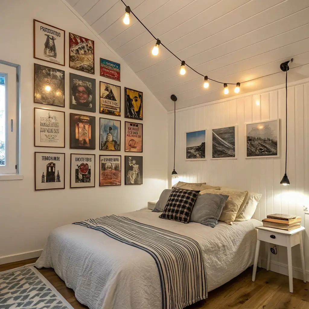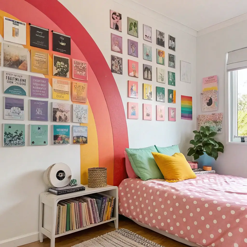 The collage style works particularly well in creative spaces like home studios or teenage bedrooms. It’s got that “I’m too cool to measure” vibe that somehow always looks intentional.