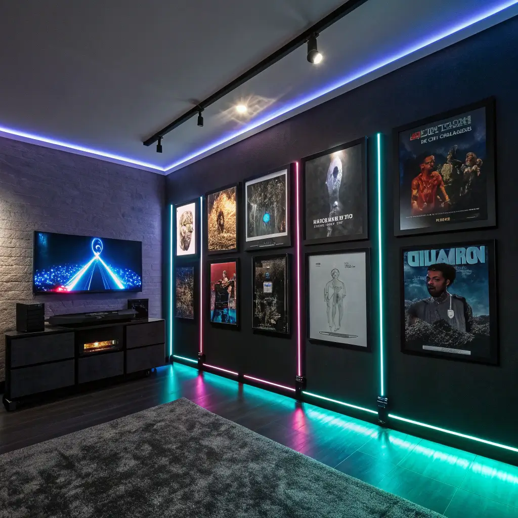 You don’t need an electrical engineering degree for this. Battery-powered LED strips with remote controls make installation straightforward. Hide the battery packs behind the frames or use cord covers painted to match your wall.