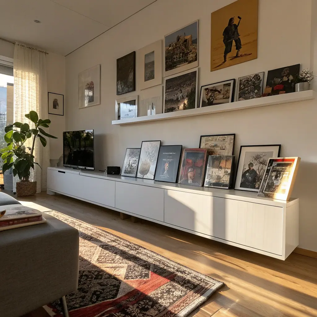 Designate a specific wall section as your “seasonal gallery”. Use a picture ledge system so swapping albums takes minutes, not hours. No new holes, no hassle.