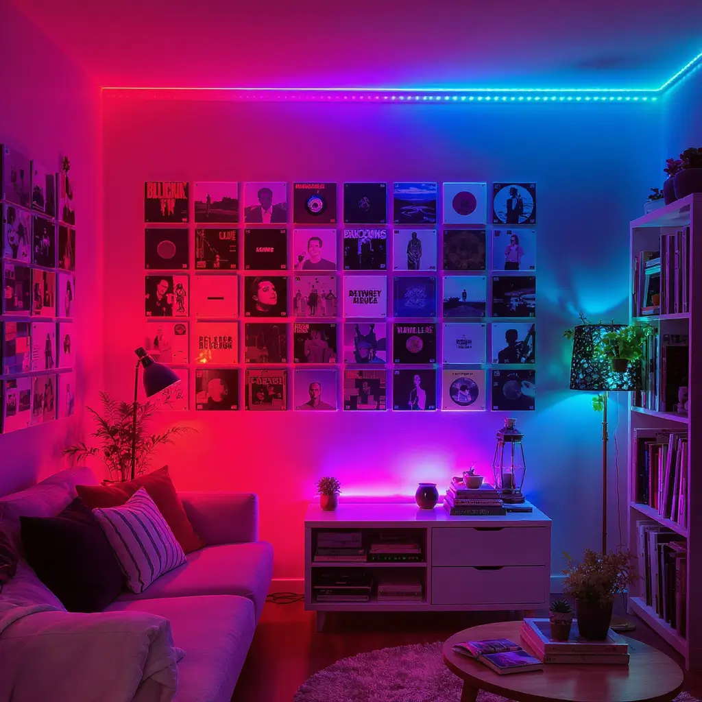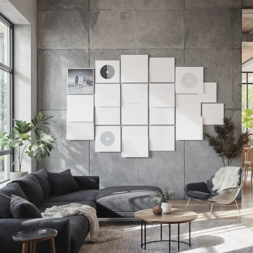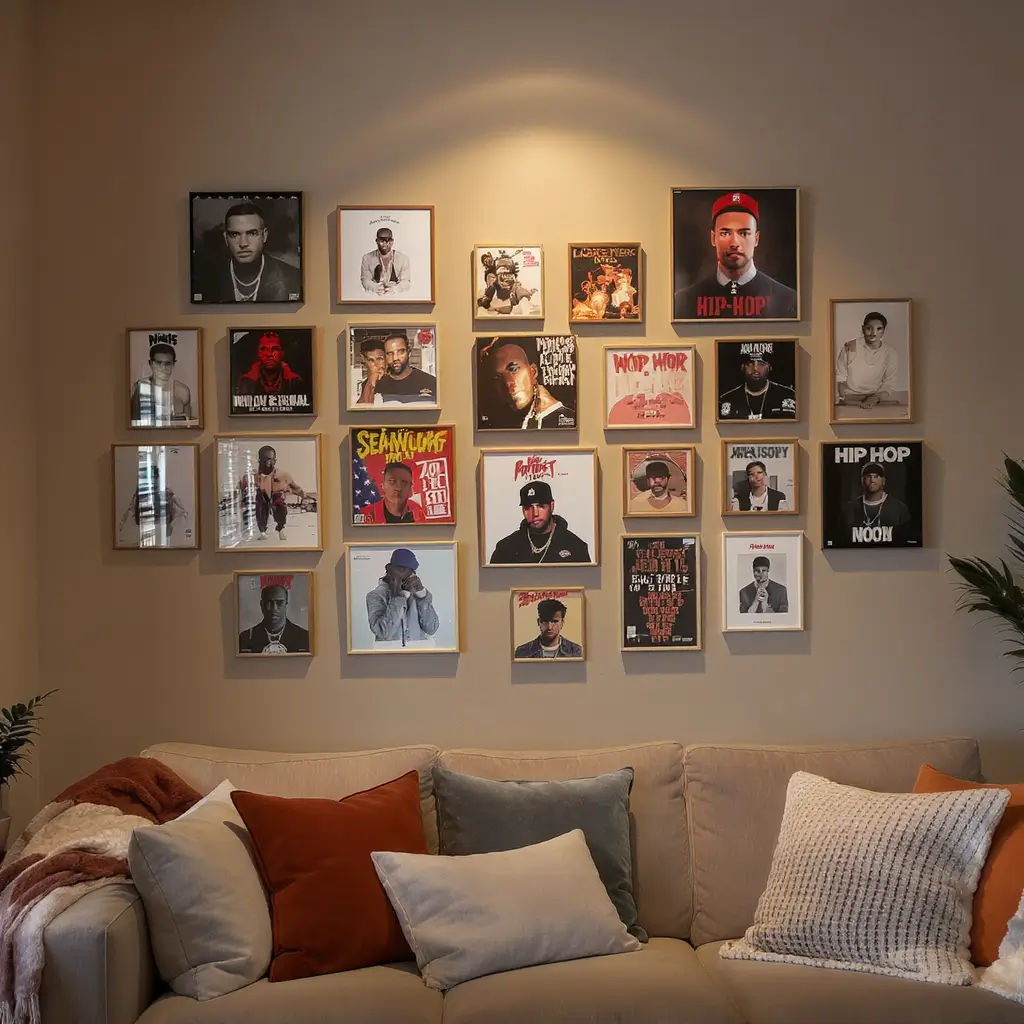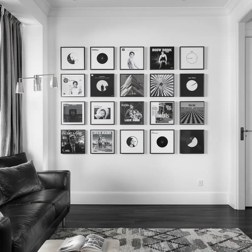 Overlap frames slightly, vary the angles, and don’t be afraid to go floor to ceiling. Add some vintage concert posters between albums for extra authenticity. This isn’t about perfection—it’s about energy.