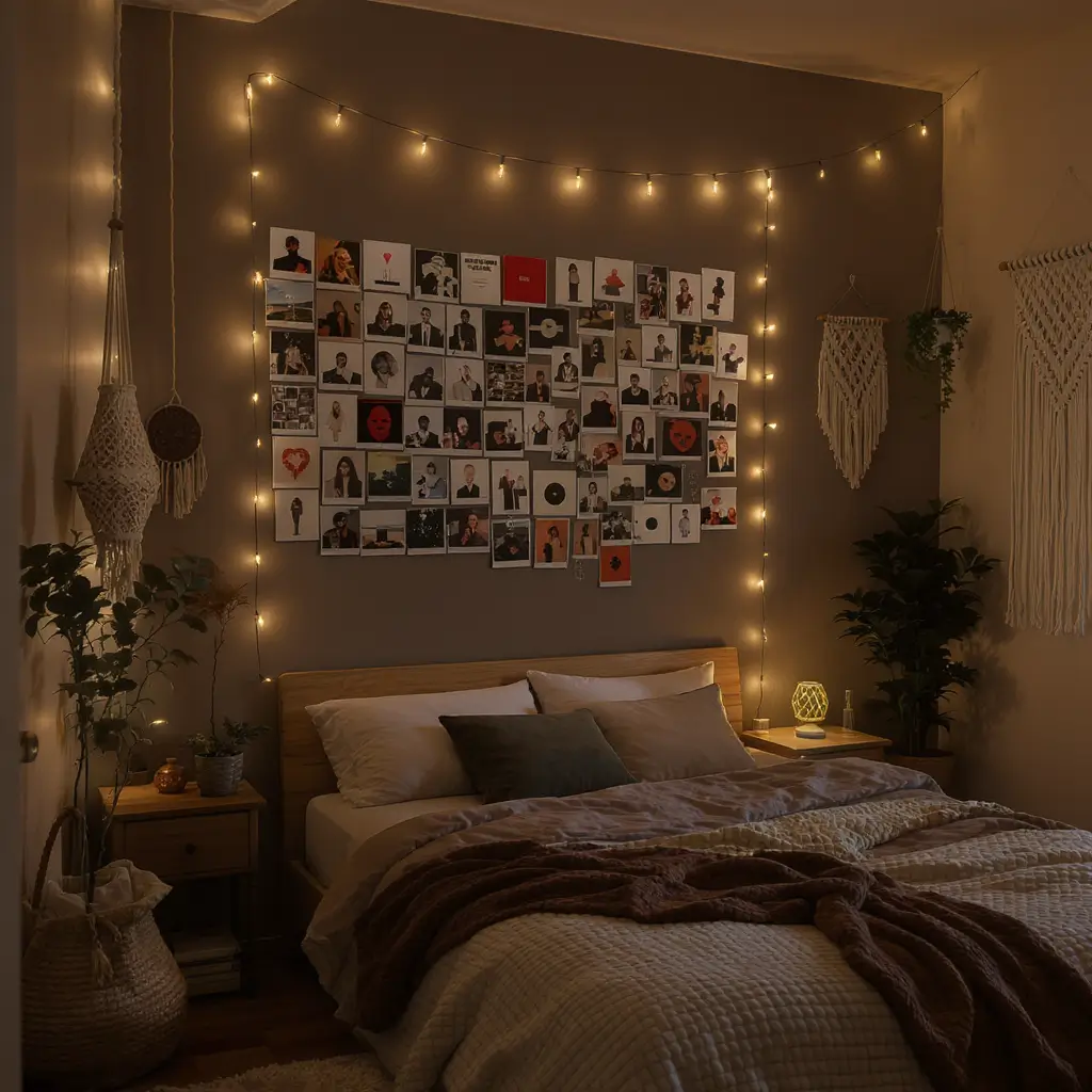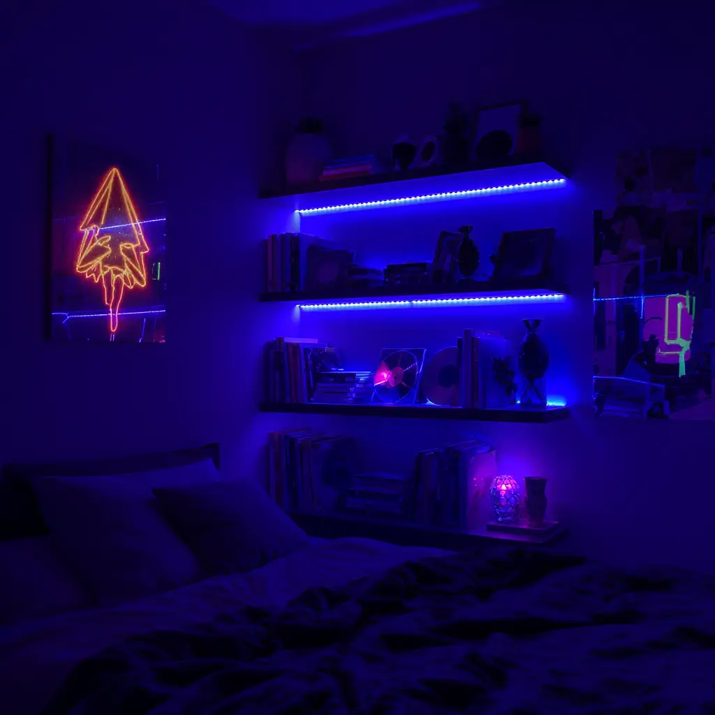Position them where you’ll see them most—above the headboard, opposite the bed, or creating a feature wall behind a reading chair. Add some warm LED strips behind floating shelves for that cozy nighttime glow.
