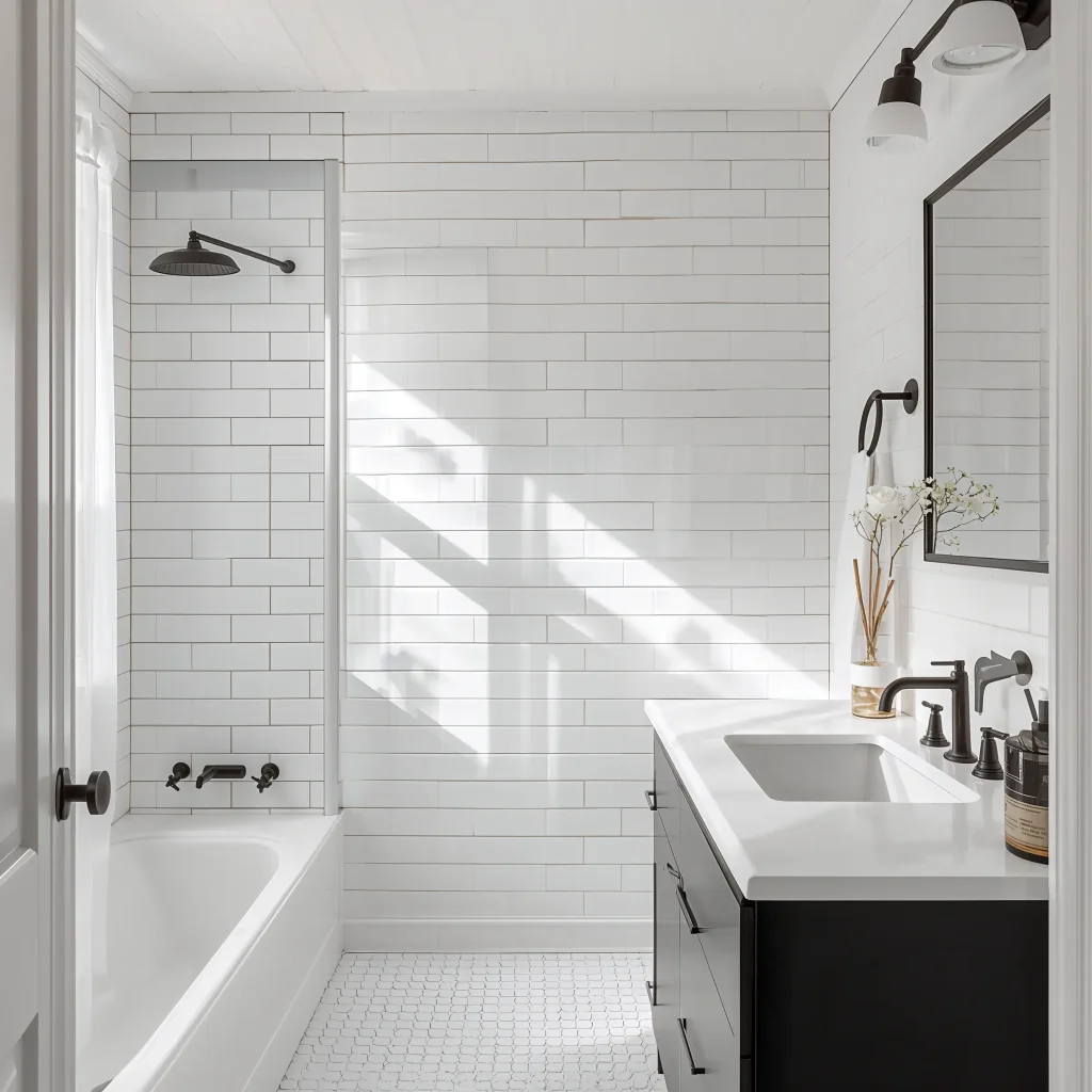 You can also mix up the size. Standard 3×6 inches works great, but larger formats like 4×12 or even 6×18 give a more modern, luxurious feel. Stack them vertically for extra height illusion, or go horizontal to make narrow bathrooms appear wider.