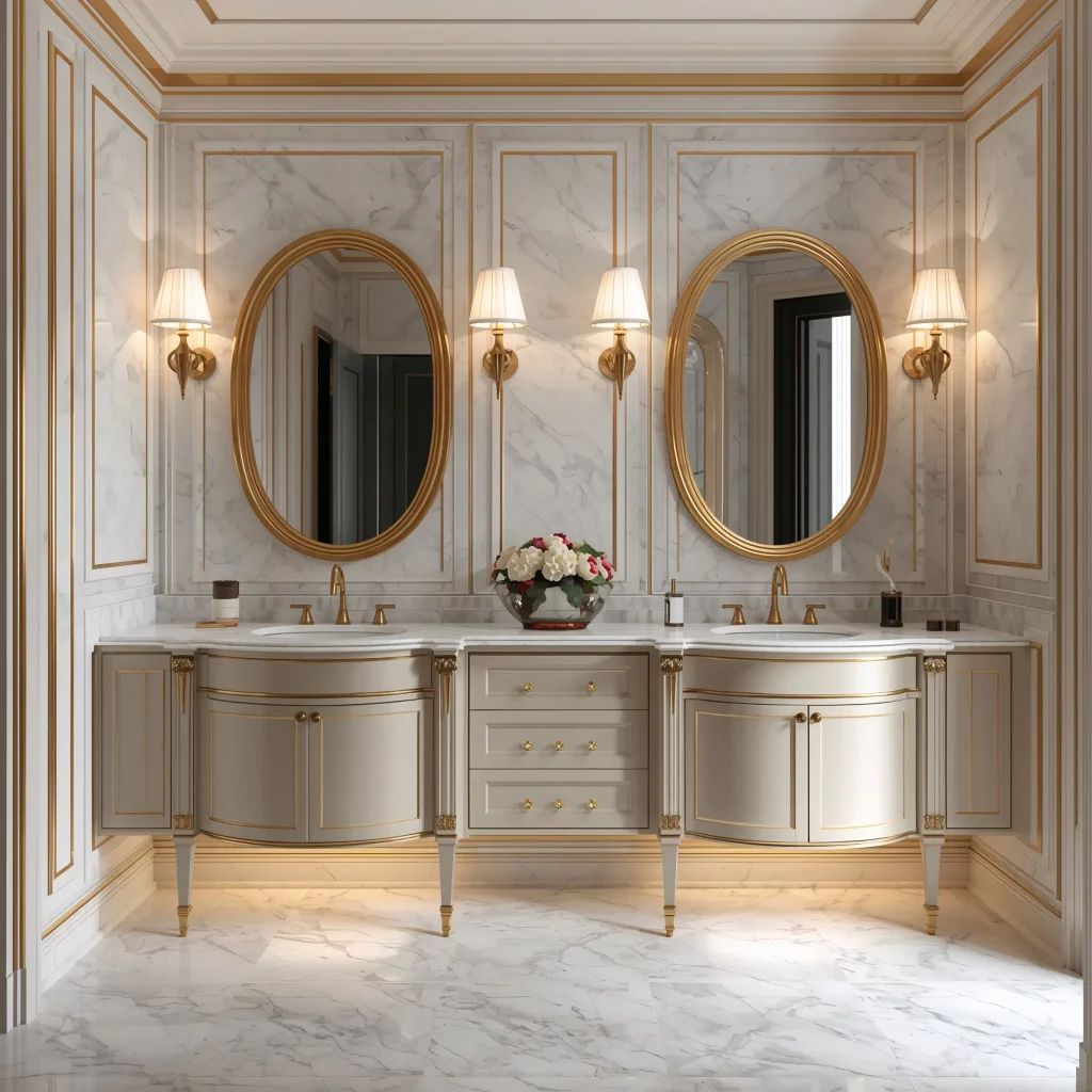 Remember, gold trim works best when your fixtures match. Brass or gold faucets, towel bars, and light fixtures create cohesion. Mixing metals can work, but it requires serious design confidence. When in doubt, commit to the gold theme fully.