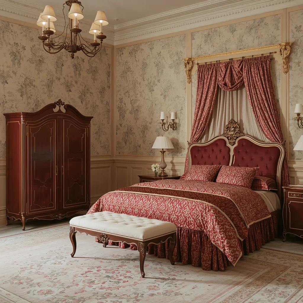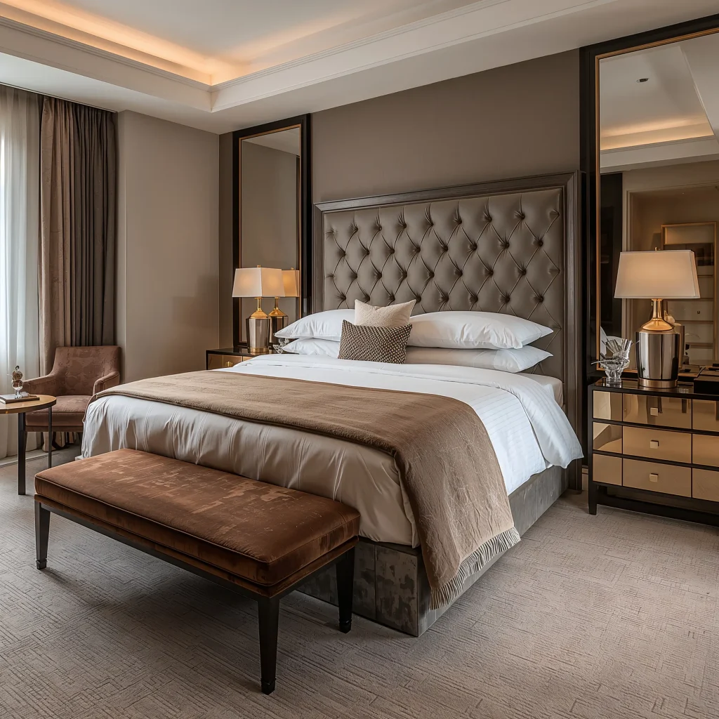 Start with a statement headboard – tufted velvet or ornate metal work beautifully. Add mirrored furniture pieces; they reflect light and make the space feel larger and more luxurious.