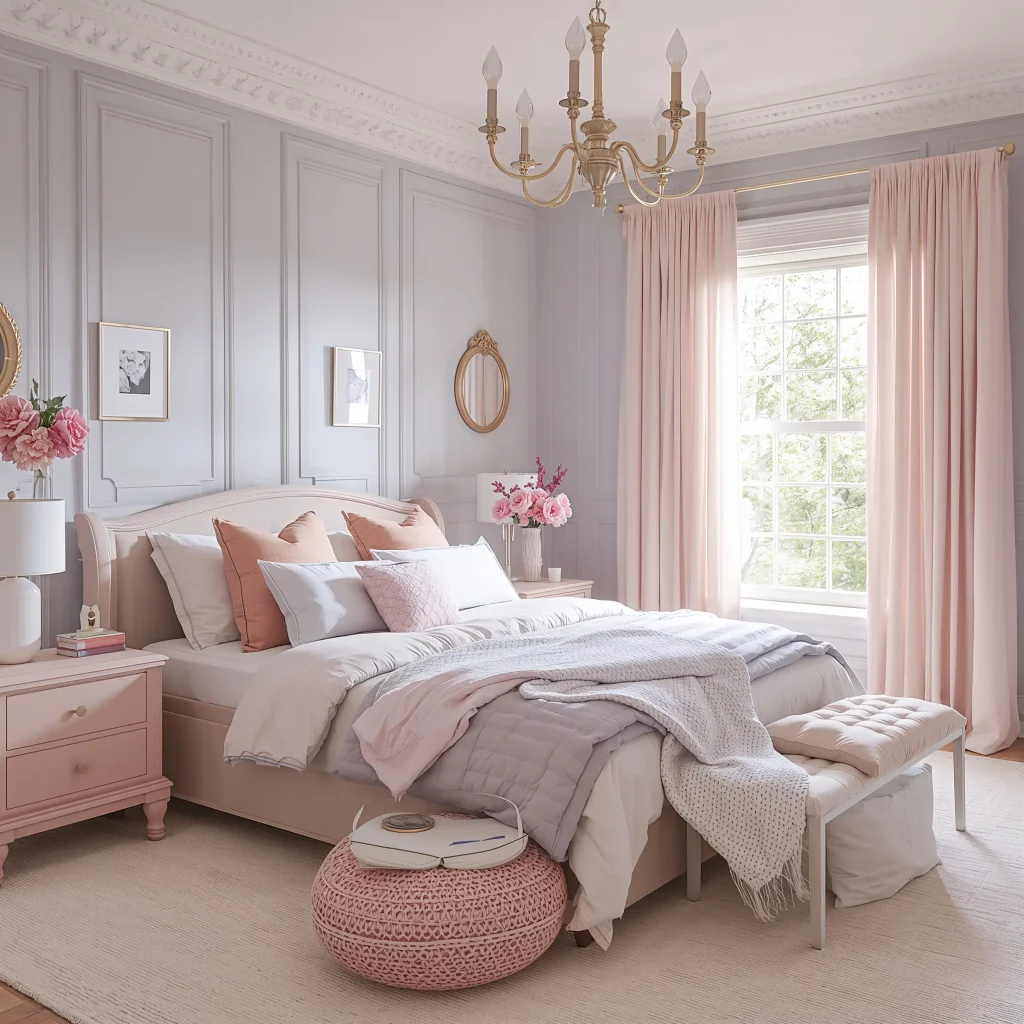 Ground pastels with deeper accents to avoid the cotton candy effect. Navy blue or charcoal gray anchors work perfectly. Use these deeper tones in smaller doses – throw pillows, picture frames, or a cozy reading chair.