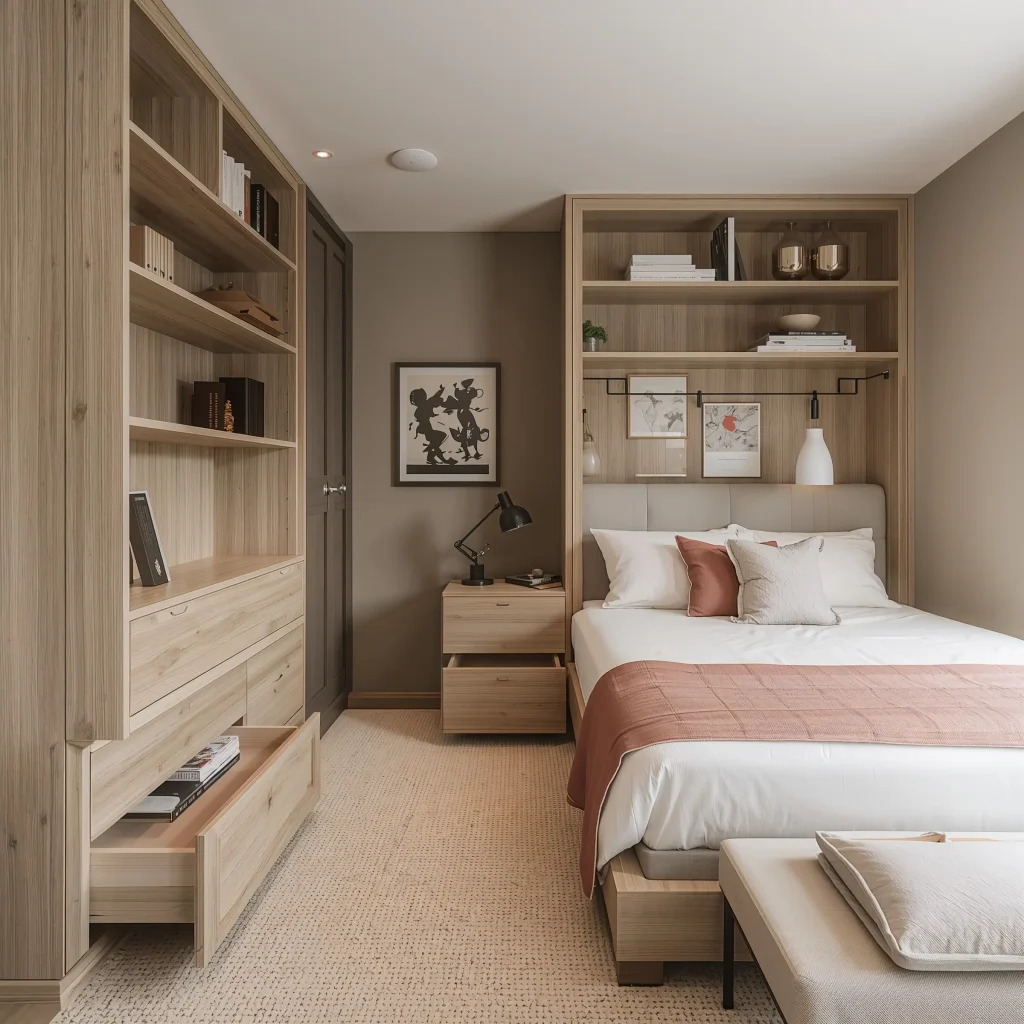 Vertical storage is your best friend. Floor-to-ceiling shelving, wall-mounted nightstands, and hanging organizers maximize every inch. The floor should be as clear as possible to create the illusion of space.