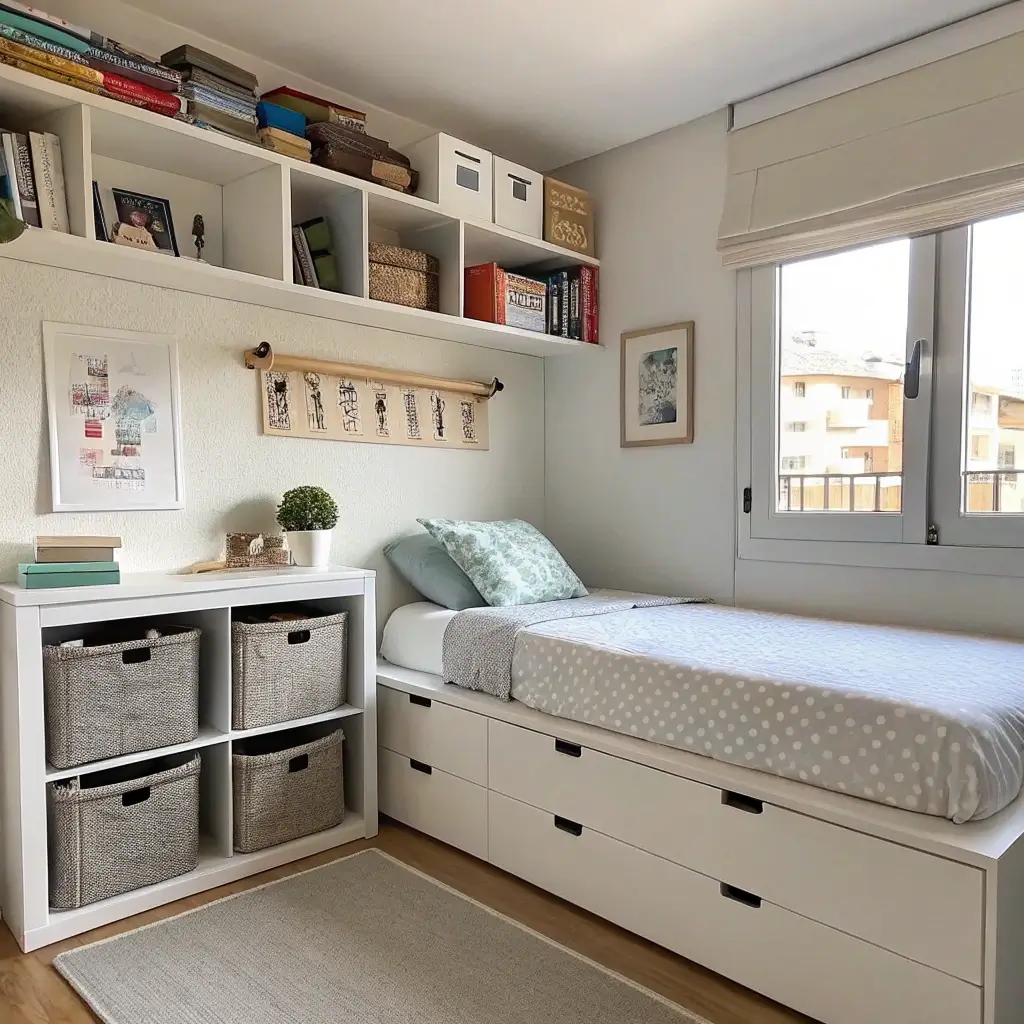 Storage in small bedrooms requires ninja-level creativity. Under-bed storage boxes are obvious, but have you considered bed risers? They give you an extra 6-8 inches of vertical storage space. That’s like finding free real estate!