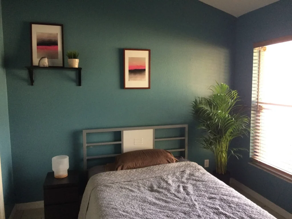r/hopavopa painted three walls in deep teal and added a darker navy accent wall for contrast. The bed has a simple grey frame with open shelving as a headboard, and the bedding is kept neutral in white and brown tones. Two framed abstract prints hang above the bed, and a tall potted plant sits in the corner, softening the space.