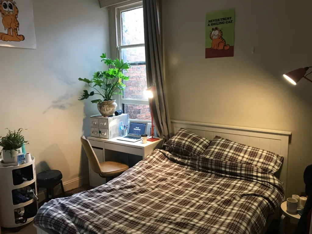 r/biomedog kept the walls bright with off-white paint and added personality through details. Plaid bedding in grey and black sits on a simple white bed frame, and a small desk by the window makes the most of natural light. A couple of humorous posters bring character without cluttering the walls, and a potted plant adds life.