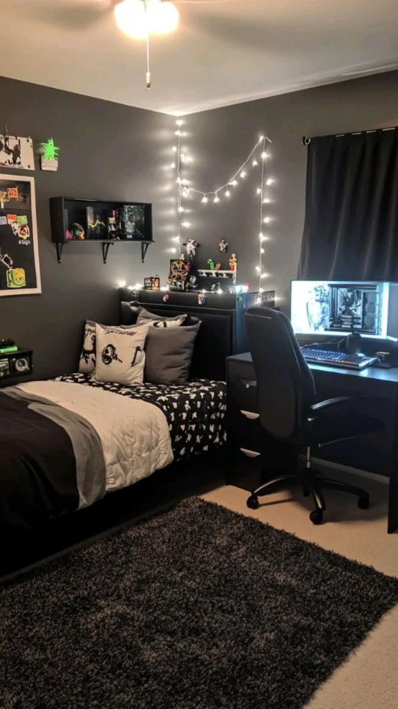 r/joscef built the room around a black platform bed with matching furniture. The walls stay light, which keeps the space from feeling closed in, and string lights add a soft glow that balances the darker tones. There’s a gaming setup in the corner, complete with a PC and shelving for display pieces.