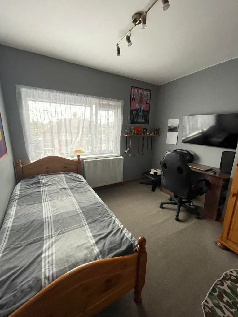 A black leather platform bed is a statement piece. It’s bold, sleek, and instantly gives the room a modern edge. This setup builds around that centrepiece without overcomplicating things.