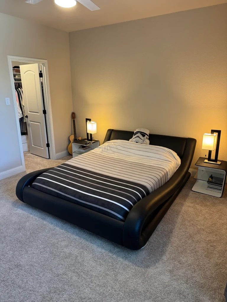 r/FoundationTimely5955 paired the bed with light walls and matching bedside tables. The bedding is striped in black and grey, keeping the look clean and structured. Two simple bedside lamps add warm light, and the carpet is neutral enough to let the bed take centre stage.
