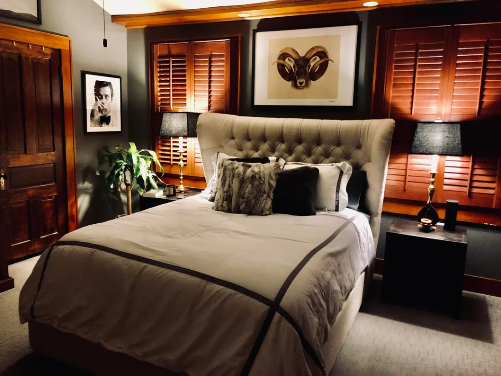 r/PowerTen combined dark grey walls with timber shutters and a tufted leather headboard. The result is a space that feels grounded and mature. Bedding is kept neutral with cream and grey tones, while black accent cushions and a faux fur throw add depth.