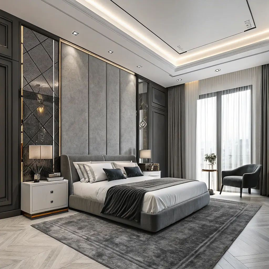 The bed should feel theatrical—tall, tufted headboards with geometric channeling work perfectly. Add matching nightstands with curved edges and reflective surfaces.
