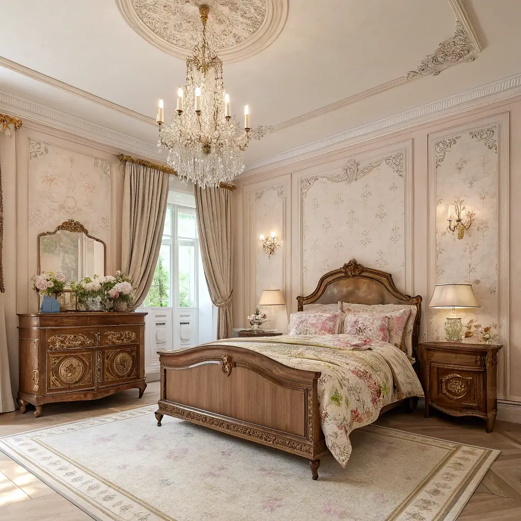 Layer soft, romantic textiles generously. Ruffled bedding, flowing curtains, and embroidered pillows all contribute to that lived-in French elegance. Don’t be afraid to mix patterns—florals with stripes with toile somehow works beautifully.
