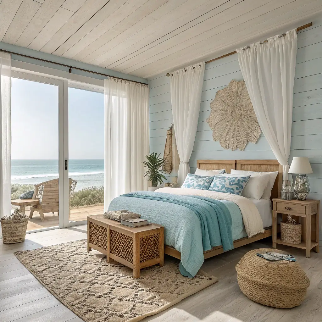 The bed should feel breezy and inviting—think four-poster in whitewashed wood or a low platform bed with a natural fabric headboard. Keep bedding light and layered.