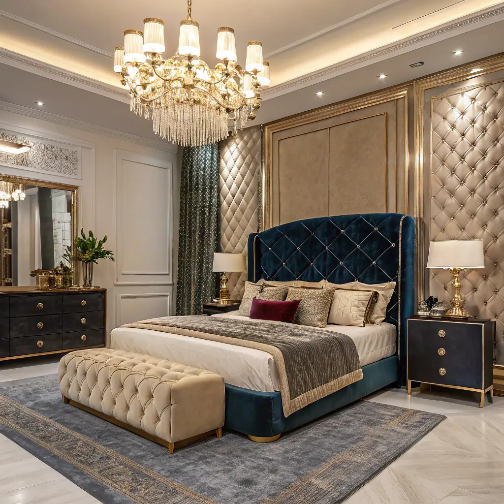 • Upholstered headboards in velvet, leather, or rich fabrics