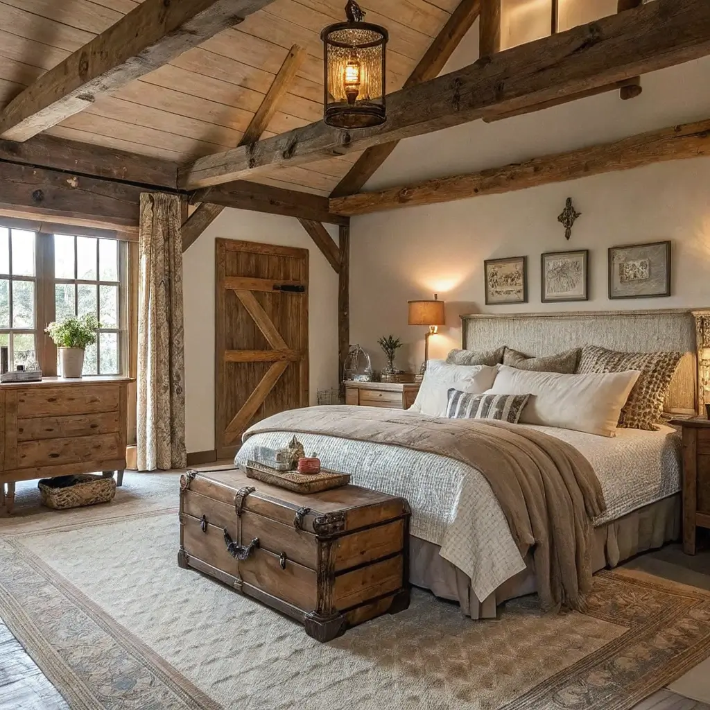 Rustic farmhouse bedrooms balance rough and refined elements. Think weathered wood alongside crisp white linens, vintage finds mixed with comfortable modern pieces.