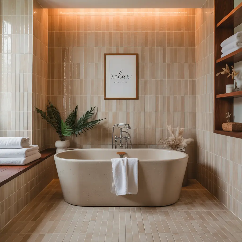 Pro tip: Go for matte finish beige tiles with wood accents. The non-reflective surface plays beautifully with the natural grain patterns in wood, creating this cohesive, spa-like atmosphere that honestly makes Monday mornings slightly less terrible.