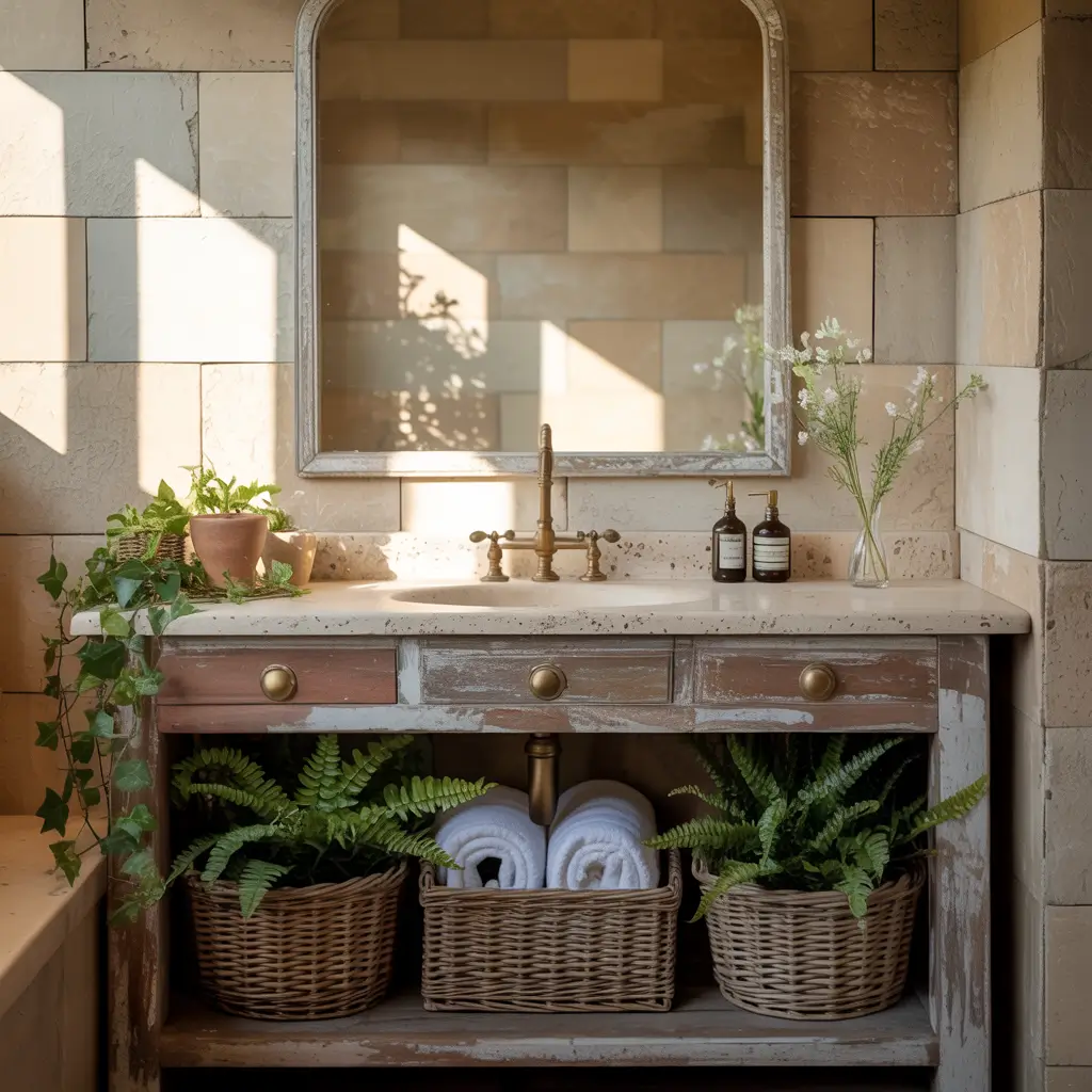 This style brings the outdoors in, and I’m completely here for it. Rustic beige tiles paired with raw natural materials create this grounded, earthy atmosphere that feels both sophisticated and approachable. Think beige tiles that mimic natural stone, paired with exposed wood beams, woven baskets, and maybe even a stone vessel sink if you’re feeling adventurous.