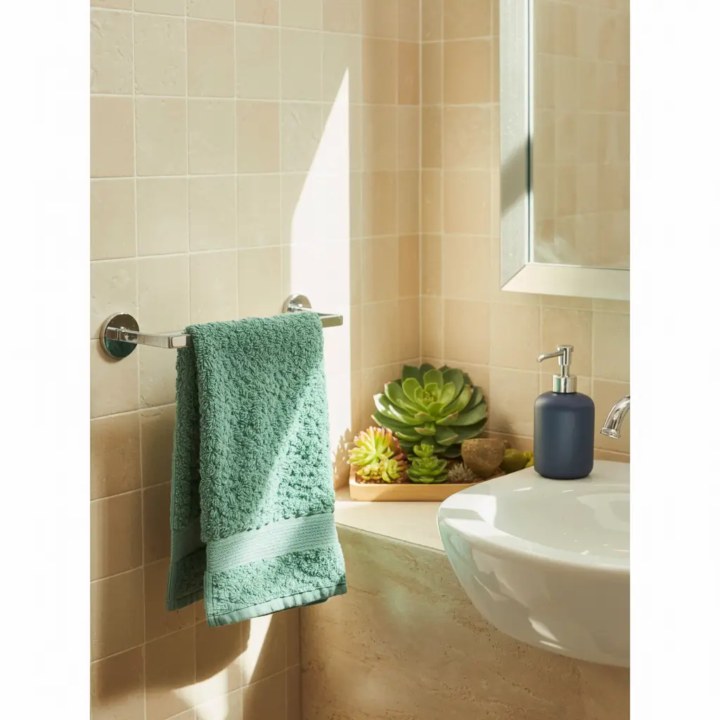 Real plants thrive in bathroom humidity. Pothos, snake plants, and peace lilies basically laugh at neglect while making your space look magazine-worthy. The contrast between organic green shapes and geometric beige tiles creates visual interest without adding clutter.