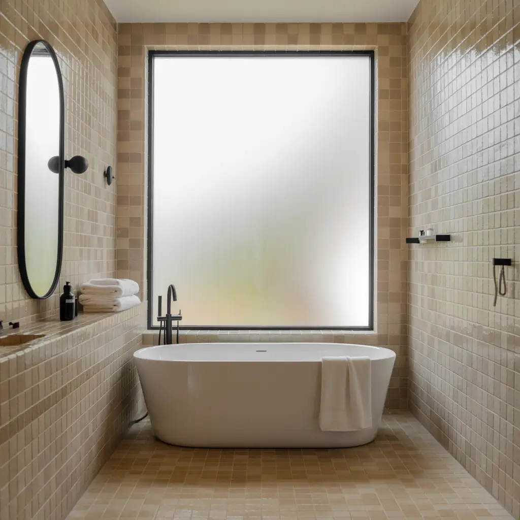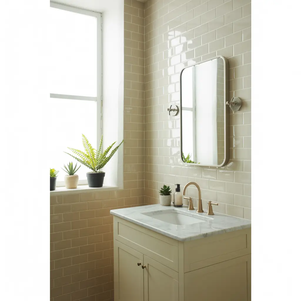 - Glossy or semi-gloss beige tiles to maximize light reflection