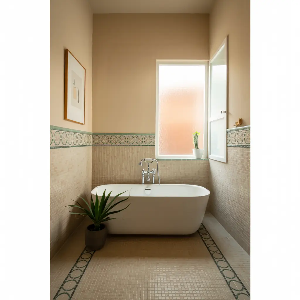 I’ve seen this done brilliantly with Moroccan-inspired patterns, geometric designs, or even simple borders. The beige base tiles keep everything cohesive while the mosaic sections become focal points that draw the eye.