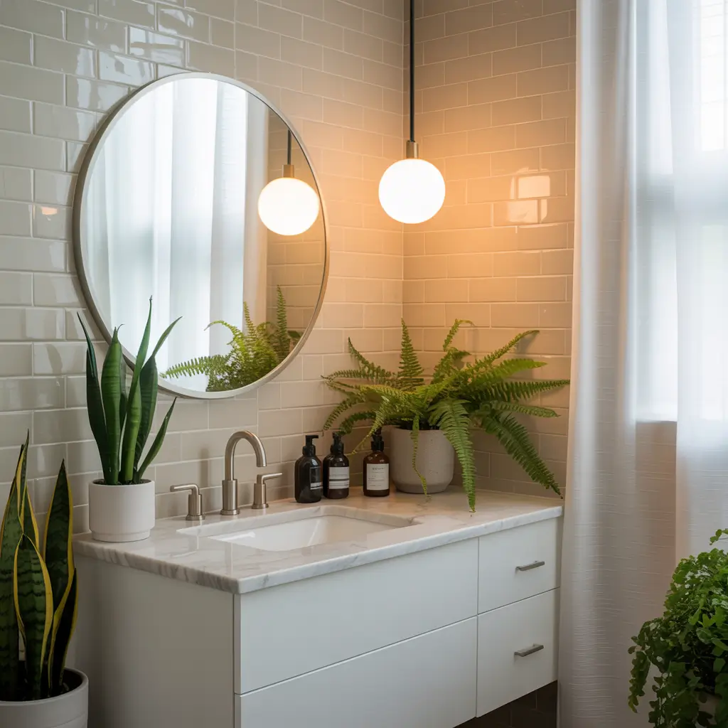 IMO, nothing beats the combo of warm beige tiles with cascading plants. It’s like bringing a piece of the jungle into your morning routine.