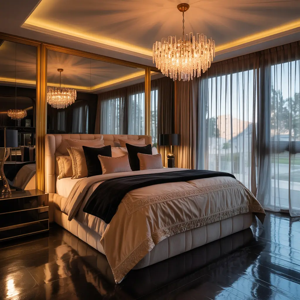 5. Elegant Black and Beige Bedroom with Gold Touches