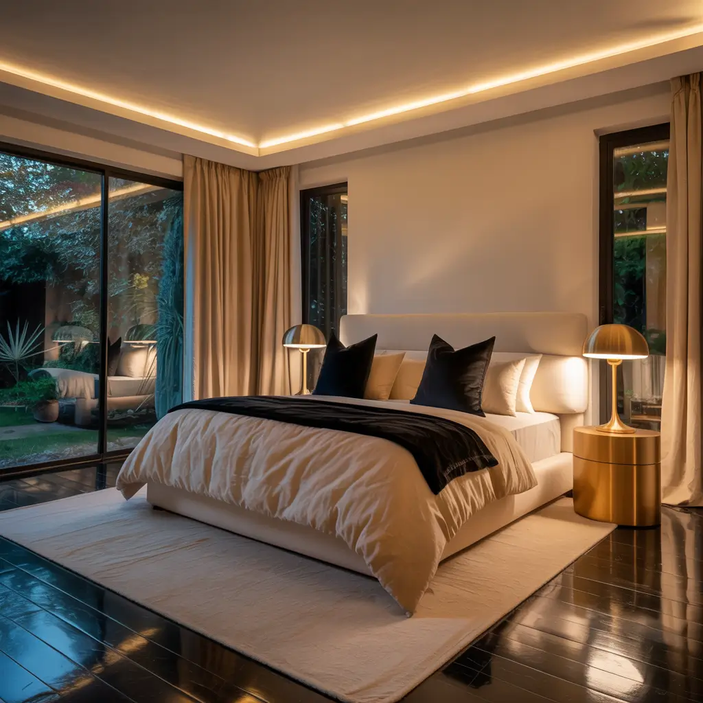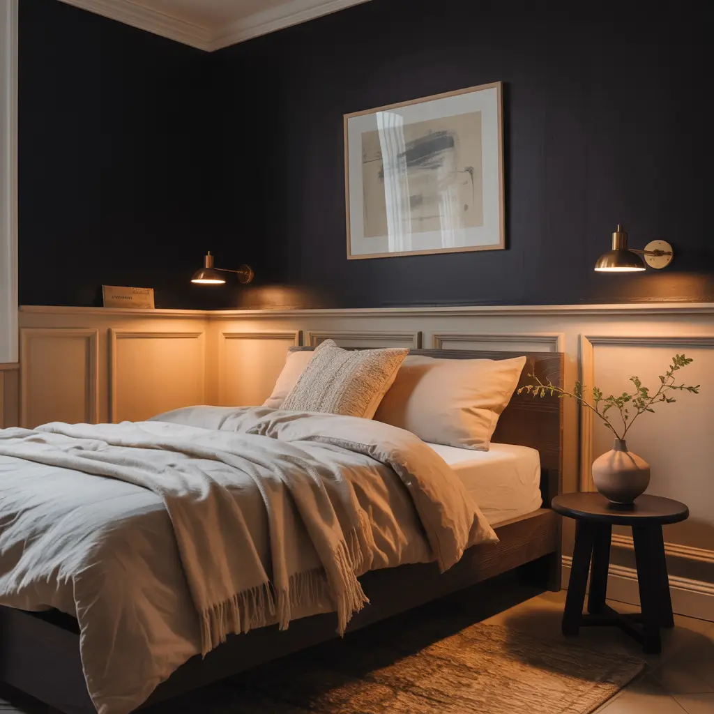 Accent lighting is where you create mood. LED strip lighting behind a black headboard, uplighting on a textured beige wall, or even candles in black and beige holders all contribute to ambiance. This is the lighting that makes your bedroom feel like a retreat rather than just a place to sleep.
