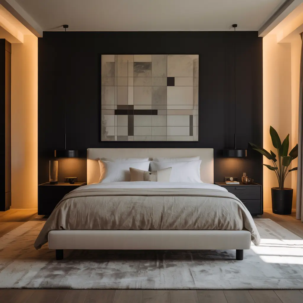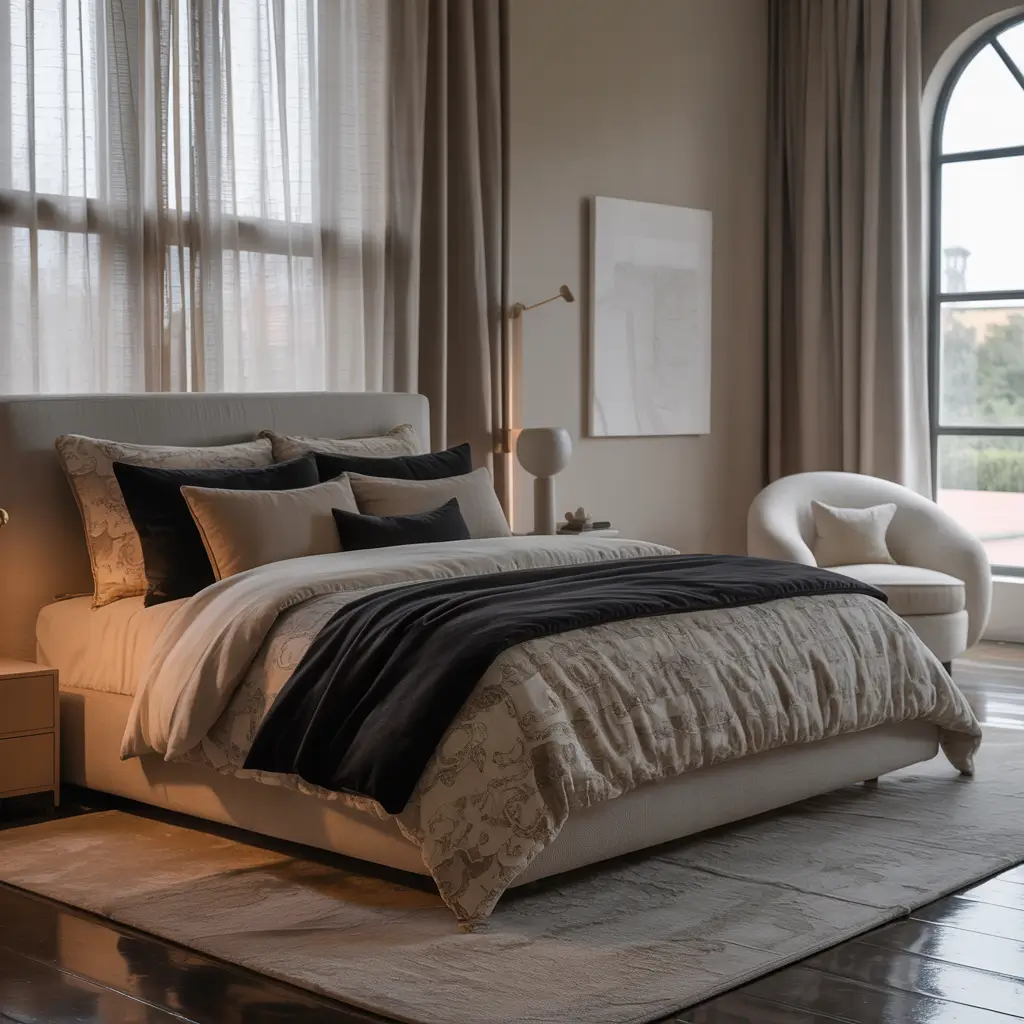 statement rug can anchor your entire bedroom design. It defines your space, adds warmth underfoot, and provides an opportunity to play with pattern and texture within your black and beige palette.