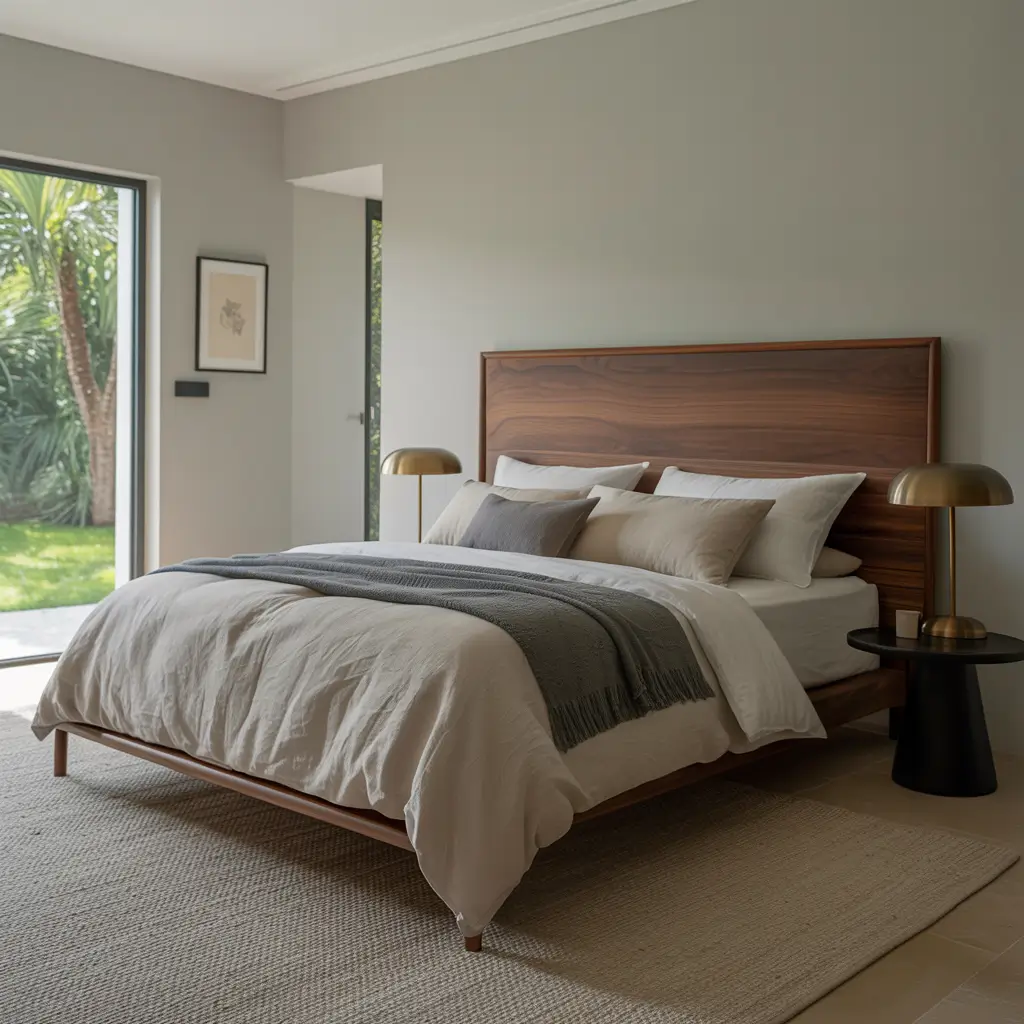 Look for pieces with distinctive silhouettes. A bed frame with a unique headboard design in black leather or upholstered beige linen makes a statement.