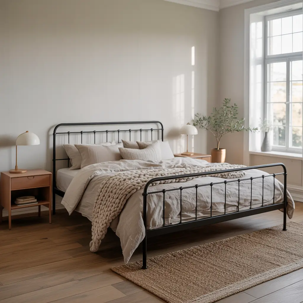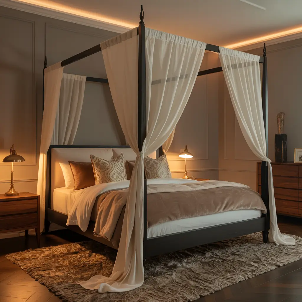 Choose a simple, modern canopy frame in matte black. Skip the frilly curtains (unless that’s your thing) and let the structure speak for itself. Surround it with warm walnut pieces – nightstands, a dresser, maybe a vanity if you have space.