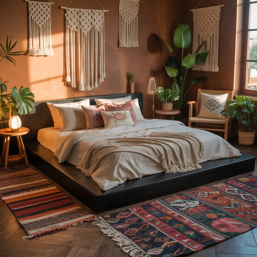 Layer brown leather poufs with black macramé wall hangings. Mix a vintage brown wood dresser with modern black geometric planters. Throw in some tribal patterns in black and white, add brown woven baskets, and suddenly your bedroom tells a story.