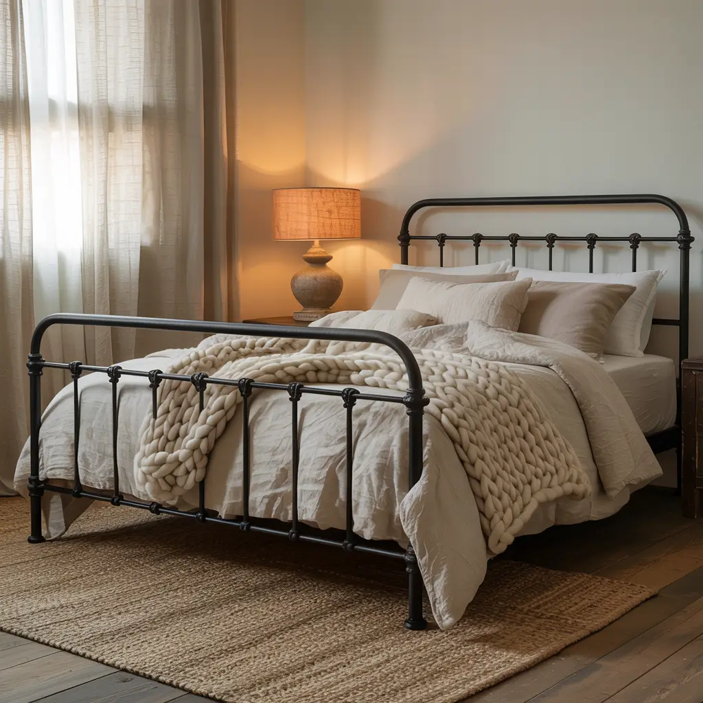 Start with reclaimed brown wood elements – maybe a barn door headboard or exposed ceiling beams if you’re lucky enough to have them. Then bring in matte black through your metal fixtures, picture frames, and maybe a statement light fixture. The matte finish keeps things from looking too shiny or modern.
