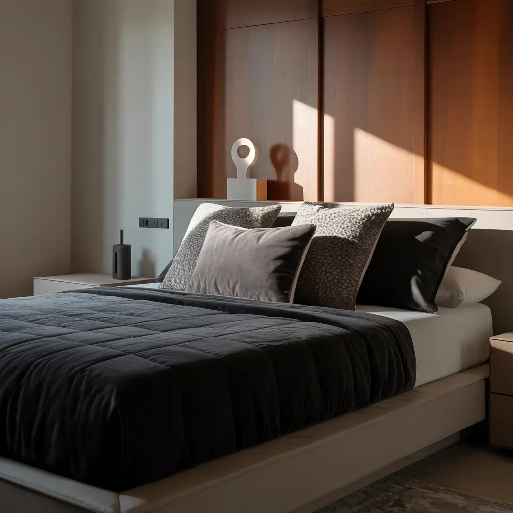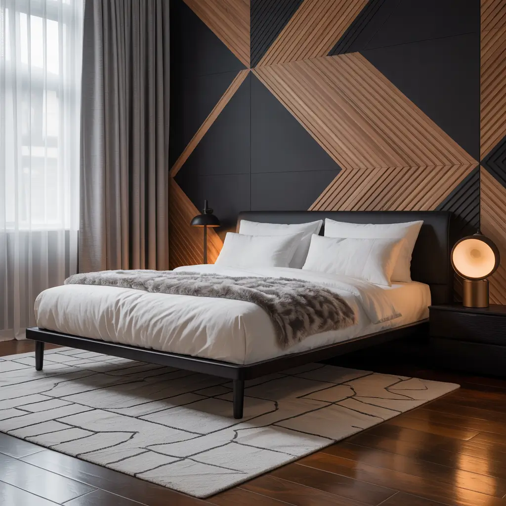 Want to know the secret sauce? Layer your lighting. Install warm LED strips behind your walnut headboard and watch how the wood grain pops against the black backdrop.