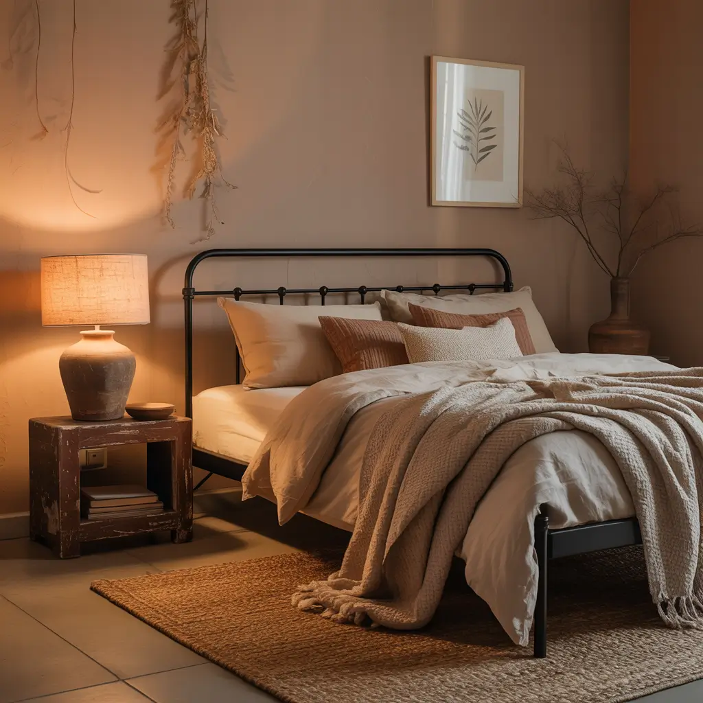 The beauty of boho? Nothing has to match perfectly. That black metal bed frame works beautifully with your grandmother’s brown wood nightstand. Trust your instincts and have fun with it.