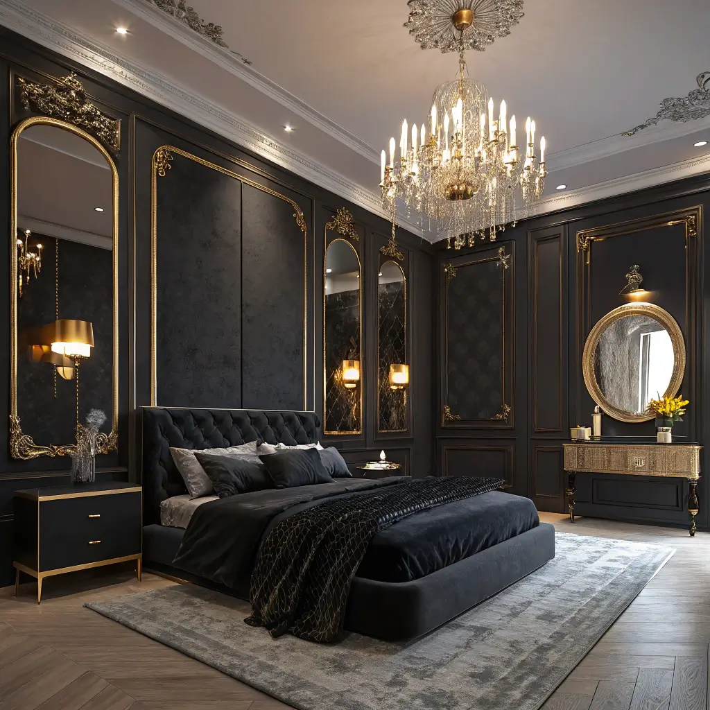 In a contemporary black and gold bedroom, you might see a curved, channel-tufted black headboard instead of a simple rectangular one. The gold accents might be softer, like a brushed brass, and appear in more organic forms.