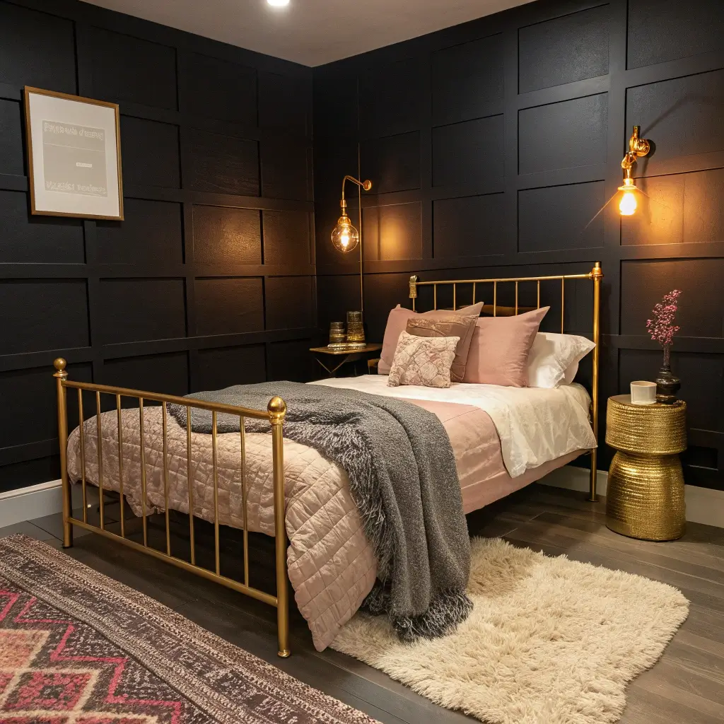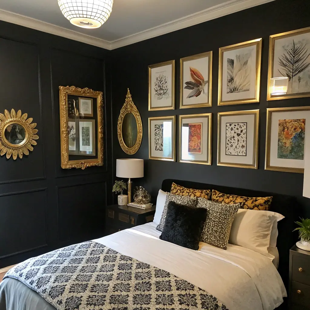 2. Cozy Black and Gold Small Bedroom Design
