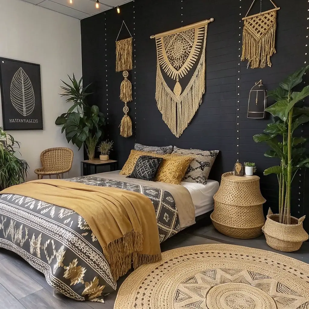 - Plants are a Must: Greenery is essential for any boho look. It breathes life into the space. Use a mix of black and gold planters to tie them into the theme. The contrast of the vibrant green leaves against the dark pots is stunning.