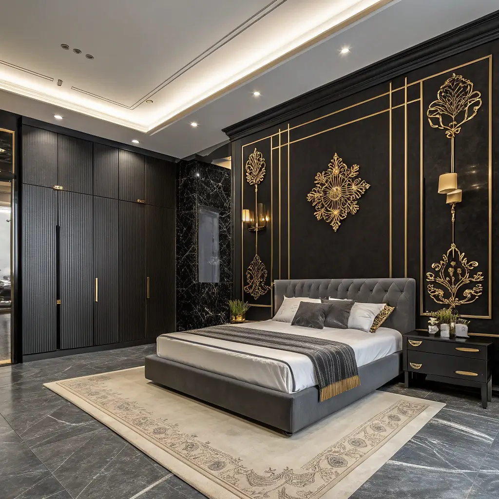 3. Modern Black and Gold Minimalist Bedroom