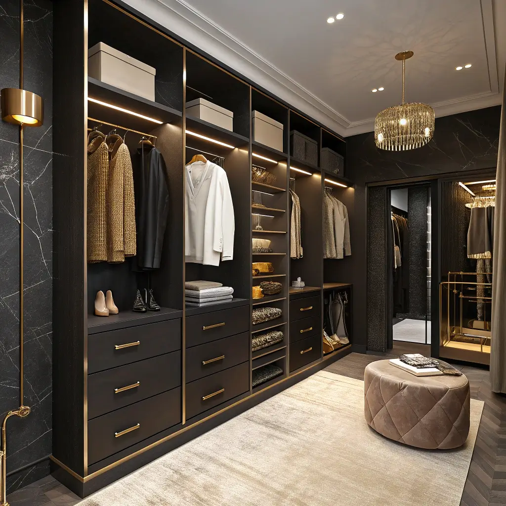 Why should the glamour stop at the bedroom door? Extending the black and gold theme into your walk-in closet transforms it from a purely functional space into a personal boutique. It’s the ultimate touch of luxury.