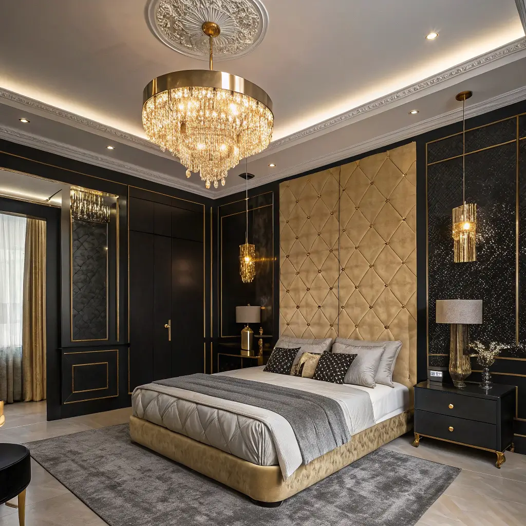 If the bedroom is a stage, then the lighting is the star performer. In a black and gold scheme, your light fixtures aren’t just functional; they are jewelry for the room.