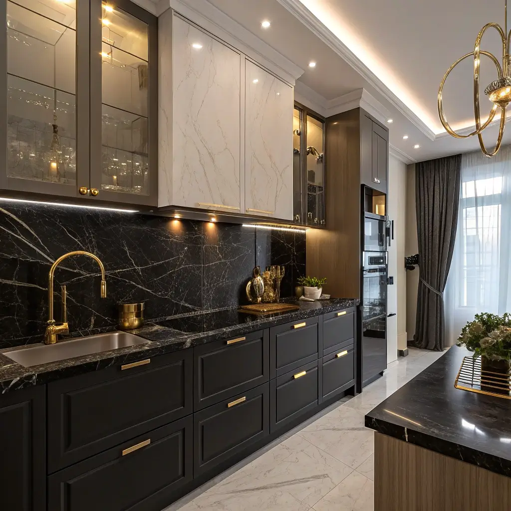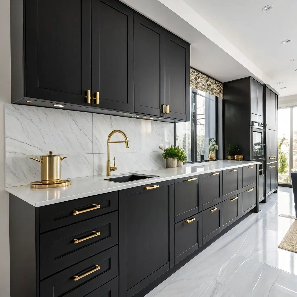 Start with handleless black cabinets – they create this seamless, futuristic look that screams modern luxury. Add thin gold trim or inlays for that subtle sparkle. The key here is restraint. You want people to notice the elegance, not count how many gold pieces you crammed in.